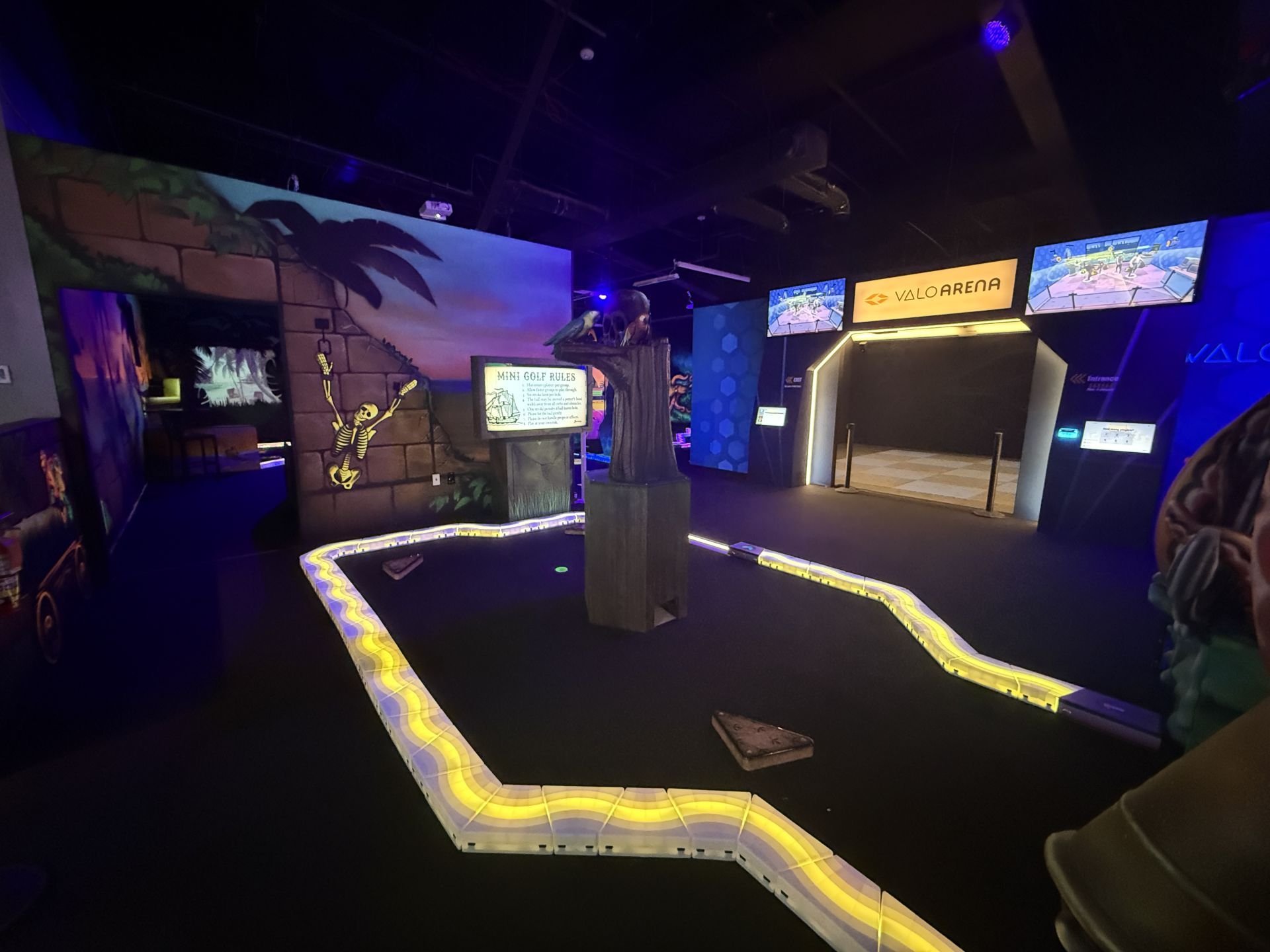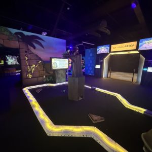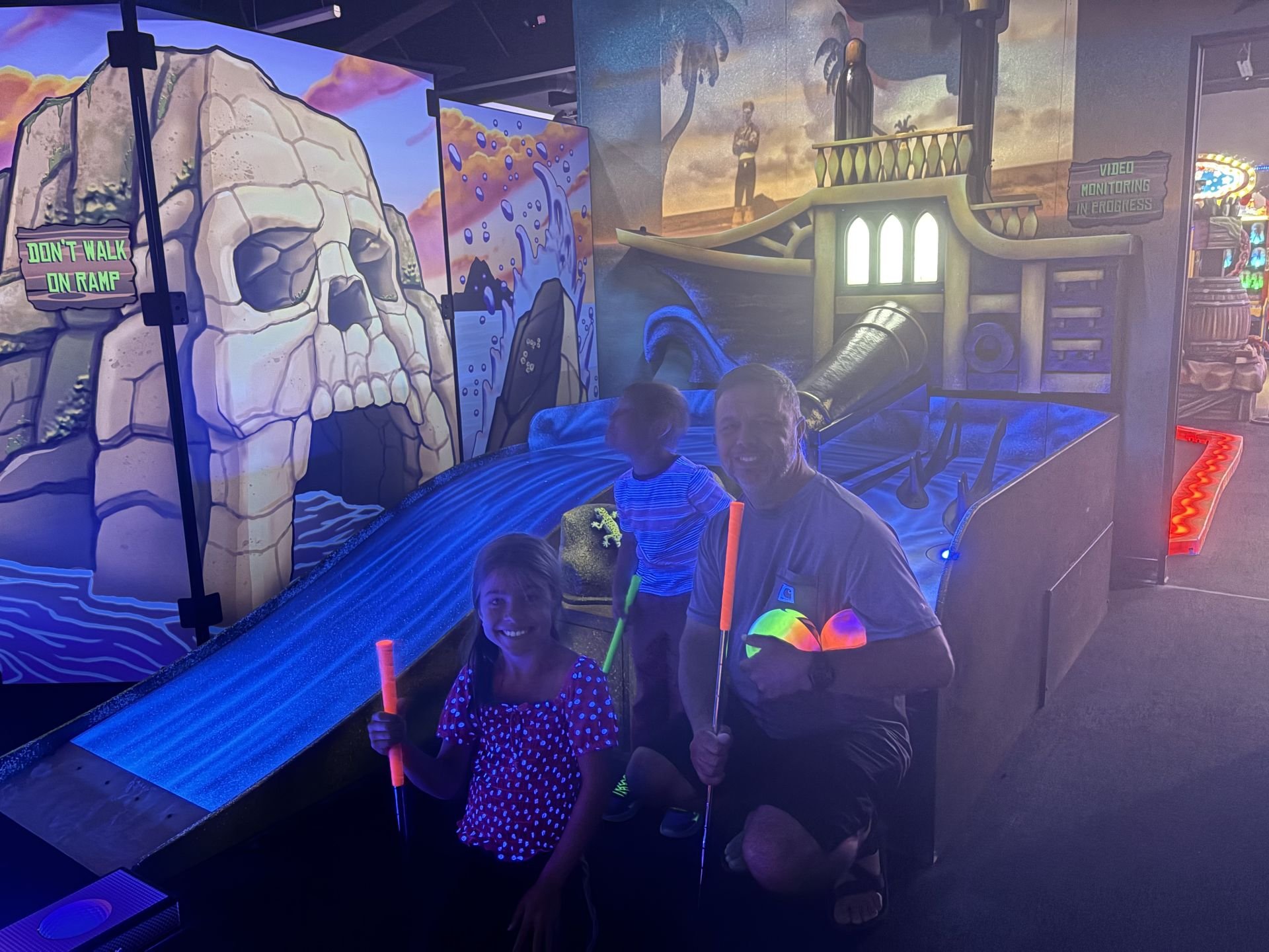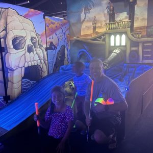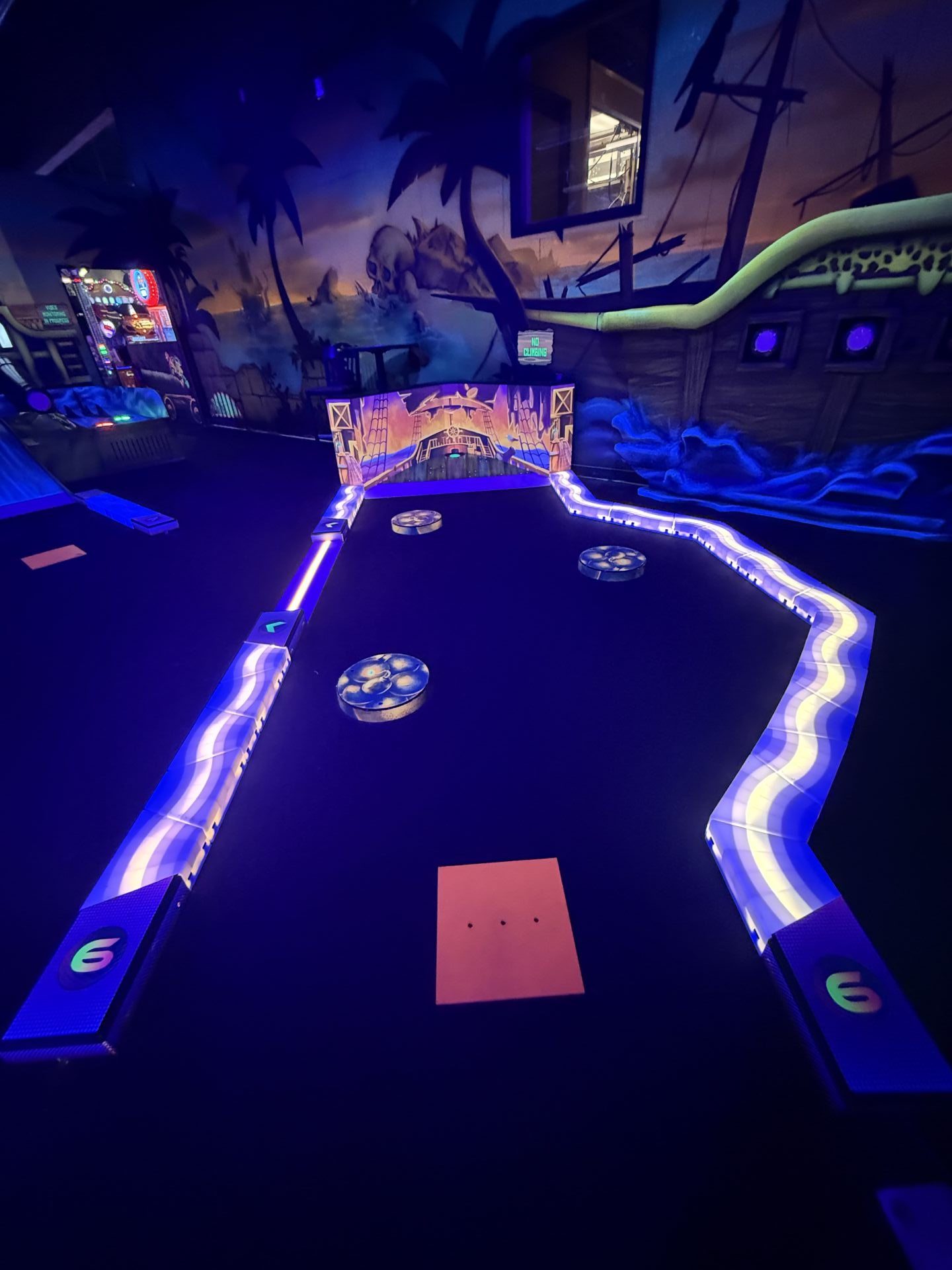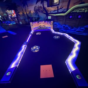 Step into a glowing adventure with our brand-new Indoor Cosmic Mini Golf! This pirate and under-the-sea themed course takes you through seven exciting holes, each surrounded by vibrant blacklight art, interactive features, and larger-than-life characters. From battling sea creatures to navigating pirate ships, every hole is a new challenge that brings the story to life. Perfect for families, friends, and groups, Cosmic Mini Golf combines fun competition with an unforgettable atmosphere you won’t find anywhere else.